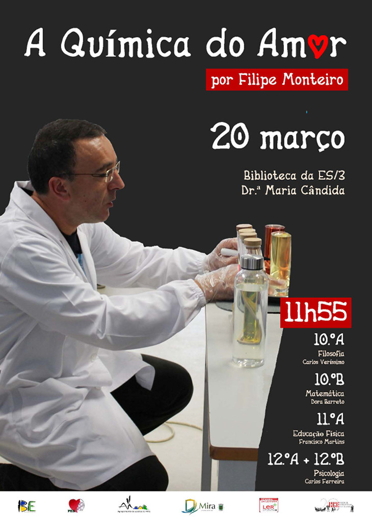 No dia 20 de março, pelas 11h55, Filipe Monteiro estará na Biblioteca da ES/3 Dr.ª Maria Cândida para apresentar a palestra “A Química do Amor”, aos alunos de Ciências e Tecnologias do Ensino Secundário.