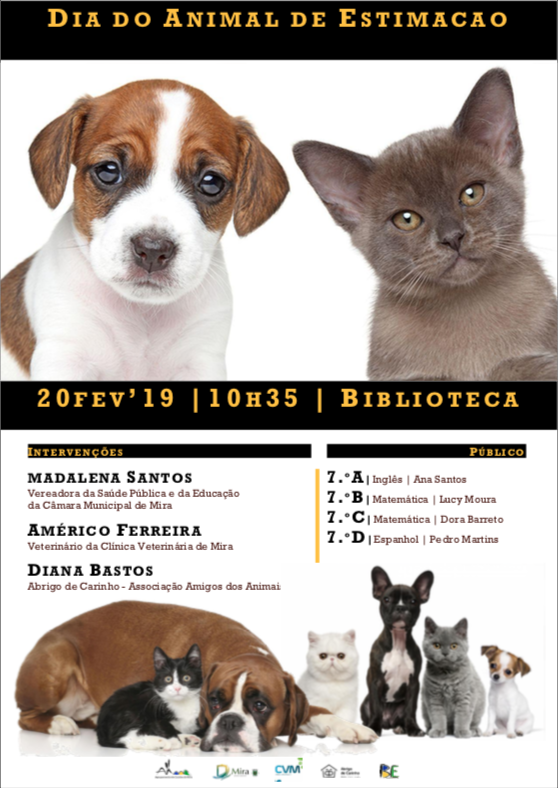 No âmbito da disciplina de EPA (Educar, Projetar e Aprender), a turma A do 7º ano irá dinamizar uma palestra sobre Animais de Estimação no dia 20 de Fevereiro, pelas 10h30m, na Biblioteca da Escola sede.