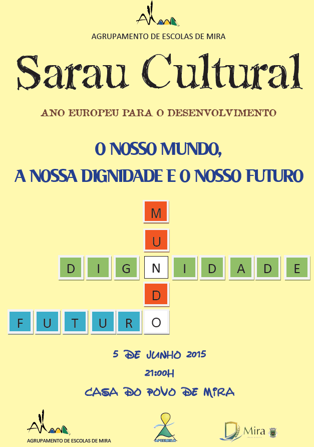 No dia 5 de junho de 2015 pelas 21 horas, na Casa do Povo de Mira, realizar-se-á o Sarau Cultural sob o tema O Nosso Mundo, A Nossa Dignidade E O Nosso Futuro.