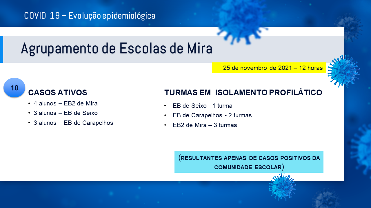 Evolução epidemiológica das Escolas do Agrupamento com base nos dados recolhidos junto da Autoridade de Saúde Local até às 12:00h do dia 25 de novembro de 2021.