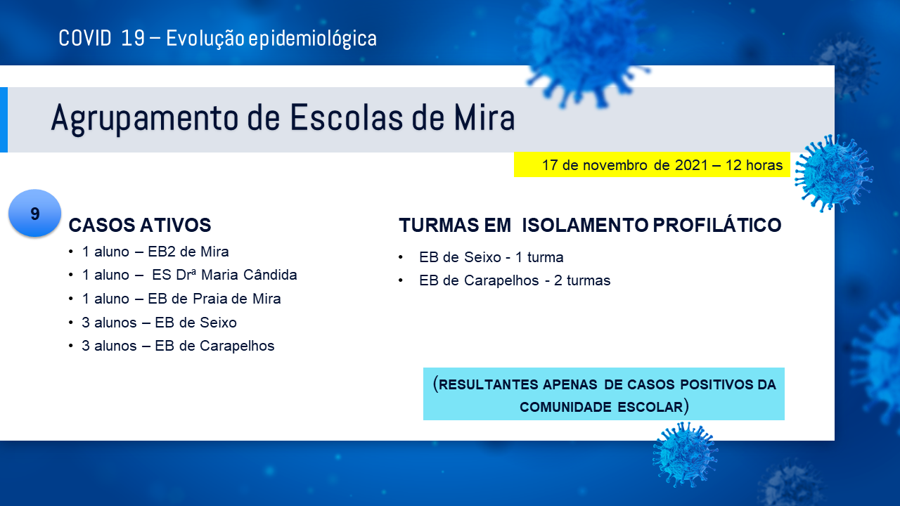 Evolução epidemiológica das Escolas do Agrupamento com base nos dados recolhidos junto da Autoridade de Saúde Local até às 12:00h do dia 17 de novembro de 2021.