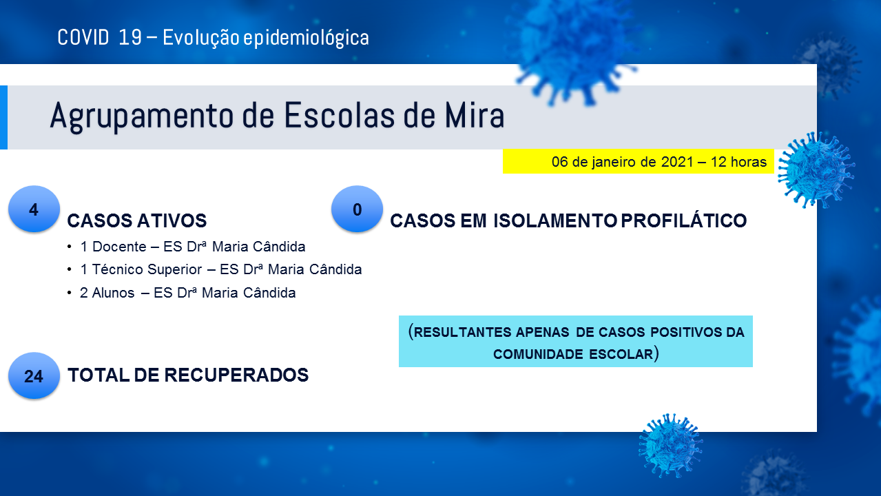 Evolução epidemiológica das Escolas do Agrupamento com base nos dados recolhidos junto da Autoridade de Saúde Local até às 12:00h do dia 06 de janeiro de 2021.