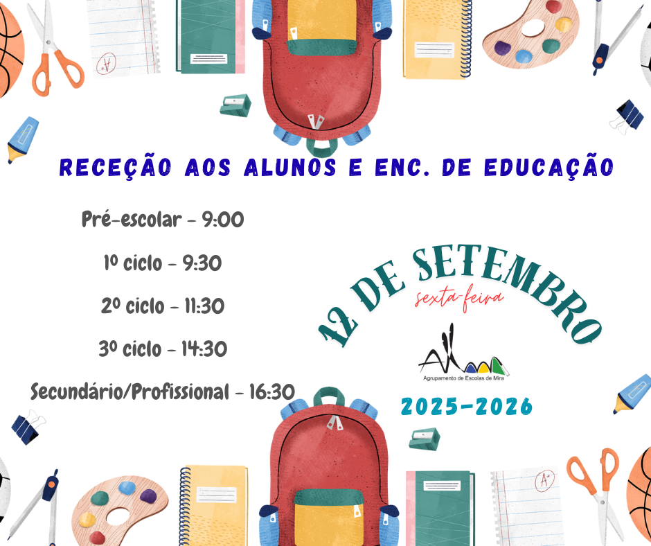 A Direção do Agrupamento de Escolas de Mira informa toda a comunidade educativa que, no próximo dia 12 de setembro de 2025 (sexta-feira), terá lugar a receção aos alunos e encarregados de educação, de acordo com o calendário definido.