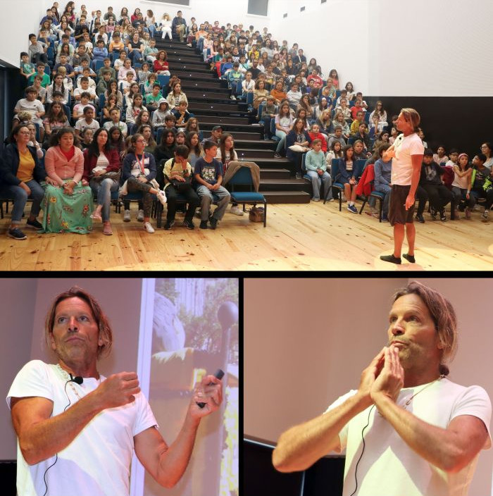 Perante um público atento e entusiasmado — onze turmas dos 4.º, 5.º e 6.º anos, acompanhadas pelos respetivos professores —, o orador partilhou a sua experiência de ativismo ambiental, sublinhando a importância das pequenas ações individuais na preservação do planeta e como recolher e separar o lixo são gestos simples, mas fundamentais.