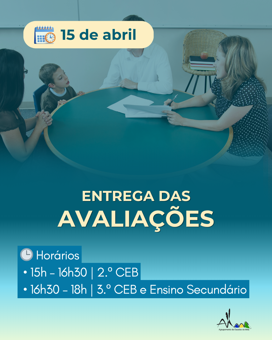 Amanhã, dia 15 de abril, decorrerá a entrega das avaliações dos alunos do 2.º e 3.º Ciclos do Ensino Básico e do Ensino Secundário.Este momento constitui uma oportunidade fundamental de acompanhamento do percurso escolar dos nossos alunos, promovendo o diálogo entre a escola e as famílias.