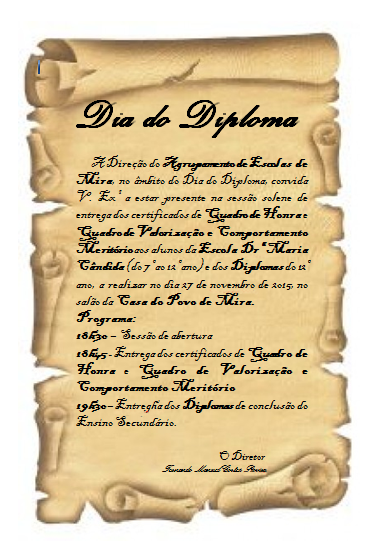 No dia 27 de novembro de 2015 pelas 18h30m, no salão da Casa do Povo de Mira, realiza-se a Cerimónia de Entrega de Diplomas aos alunos que concluíram o 12º ano, assim como os alunos do 3º ciclo e ensino secundário que integram o Quadro de Valorização e Comportamento Meritório.